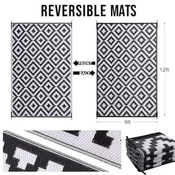 OLANLY Waterproof Outdoor Rug 9x12 ft, Plastic Straw Rug for Camping, RV Mat Outside, Indoor Outdoor Carpet for Porch, Deck, Backyard, Balcony, Picnic, Black & White