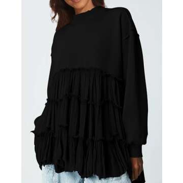 OLAPTA Women Patchwork Pleated Baggy Sweatshirt Colorblock Mock Neck Long Sleeve Drop Shoulder Pullover Sweater Top (Small, All Black)
