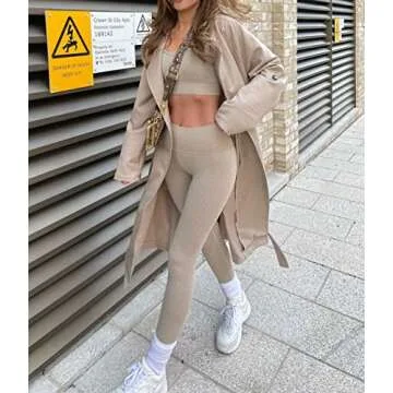 Show more Introducing the OLCHEE Women's 2 Piece Workout Outfits—a perfect blend of style, comfort, and functionality designed especially for active women. This seamless ribbed set includes high-quality leggings and a stylish sports bra in an elegant khaki color, tailored to enhance your workout experience, no matter the activity. Crafted from premium materials, the leggings are designed to provide just the right amount of compression, allowing you to move freely while feeling supported. Experience the perfect combination of aesthetics and performance at the gym or yoga studio with this versatile activewear set.