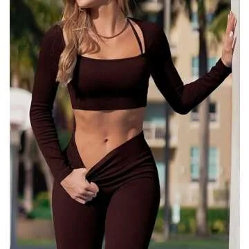 OLCHEE Womens Seamless Ribbed Workout Sets - Stylish Brown Gym Outfit