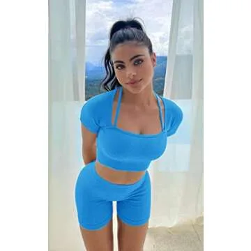 OLCHEE Womens Workout Sets 2 Piece - Seamless Ribbed Gym Outfits Short Sleeve Crop Top and Mini Shorts Matching Yoga Clothes - Sky Blue Large