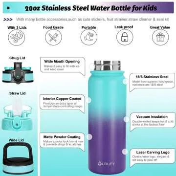 Oldley Insulated Water Bottle with Straw 20oz Stainless Steel Water Bottles with 3 lids Double-Wall Vacuum Thermal for Kids Adults School Sports, A-Green-purple