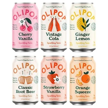 Show more Introducing the **OLIPOP 6-Flavor Soda Variety Pack**, your new guilt-free indulgence that combines the nostalgic flavors of classic sodas with health benefits you can feel good about! Each pack contains six unique flavors—Vintage Cola, Classic Root Beer, Strawberry Vanilla, Orange Squeeze, Cherry Vanilla, and Ginger Lemon—perfect for those looking to satisfy their cravings while also supporting their digestive health. With a focus on low calories and low sugar content, OLIPOP is expertly crafted to ensure that every sip is delightful and guilt-free. Not only do these prebiotic soft drinks taste great, but they actively work to enhance your gut health by incorporating plant fibers that boost digestion.