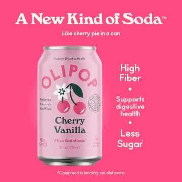 Show moreDiscover the vibrant world of Olipop Cherry Vanilla, a revolutionary beverage that seamlessly blends the nostalgic flavors of traditional soda with the modern benefits of health-conscious ingredients. Each amazing pack houses 12 refreshing 12oz cans, each a fizzy delight that harmonizes the tartness of cherries—both classic and Rainier—with the luscious essence of vanilla bean. Imagine taking a sip of a drink that isn't just a tasty treat but also supports your digestive health with its effective blend of prebiotics and plant fibers. It's the perfect beverage that allows you to relish the joy of soda without the guilt!
