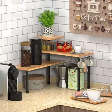 Ollieroo Kitchen Counter Shelf Organizer, 3 Tier Corner Shelf Bamboo Bathroom Countertop Organizer with Hooks, Space Saving Makeup Organizer Spice Rack Corner Plant Shelf