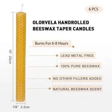 Show more Illuminate your space with the warmth and elegance of the Olorvela Natural Handmade Beeswax Taper Candles. Specially crafted from premium, all-natural beeswax, these 10-inch taper candles are the perfect addition to any home décor or special event. Each candle is non-toxic, lead-free, and hypoallergenic, ensuring that you and your loved ones can enjoy a clean burn without harmful chemicals. The 100% pure cotton wick allows these candles to burn steadily and cleanly, giving you hours of delightful ambiance and a subtle honey aroma that adds charm to every setting.