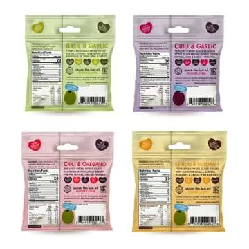 Show more Discover the ultimate snacking solution with Oloves Variety Pack, a healthy and flavorful option that satisfies your cravings without the guilt. This delightful assortment features four exquisite flavors: Basil & Garlic, Chili & Oregano, Lemon & Rosemary, and Black Olive Chili & Garlic. Each individual pack delivers a burst of taste while keeping your calorie count low at just 50 calories per serving, making it ideal for any health-conscious eater.