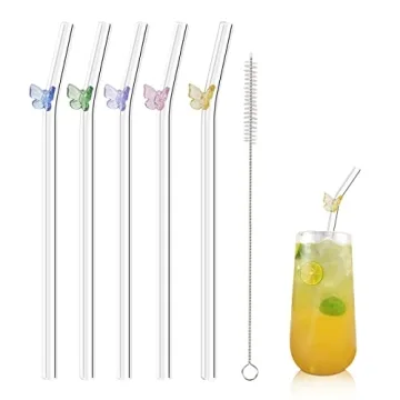Olpchee 5 Pcs Reusable Glass Straws with Butterfly Design & Cleaning Brush