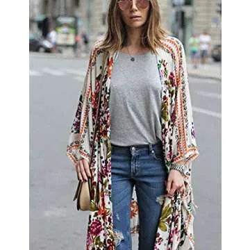 olrain Women Floral Flowy Kimono Cardigan Long Bikini Beach Cover Up Loose Tops (White Small)