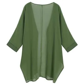 olrain Women's Floral Print Sheer Chiffon 3/4 Bat Sleeve Casual Loose Kimono Cardigan Capes (Large, Deep Green)