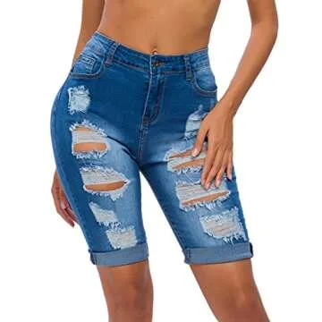 olrain Womens High Waist Ripped Hole Washed Distressed Short Jeans 14 Blue