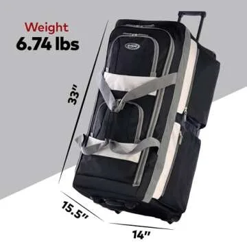 Show more Introducing the Olympia U.S.A. 33 inch Jumbo Size Wheeled Rolling Duffel Bag – the ultimate travel companion designed for the modern adventurer. Crafted from high-quality, durable water-resistant Protecflon 1200 D polyester, this spacious duffel bag is lightweight, making it a breeze to carry on any flight or road trip. With its stylish retractable handle and chic design, this bag not only meets travel needs but also adds a touch of elegance to your journey. Perfect for vacations, business trips, or daily commutes, the Olympia duffle bag is the must-have gear for every traveler.