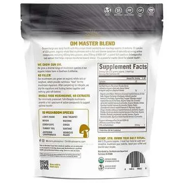 Show moreIntroducing the Om Mushroom Superfood Master Blend, a powerful synergy of health-boosting components designed to elevate your daily wellness routine. Comprising a unique formula that combines 10 species of organic whole food mushrooms, including renowned varieties like Cordyceps, Reishi, Lion’s Mane, Turkey Tail, Chaga, and others, this powder supplement offers a comprehensive approach to vibrant health. With each 6.2/6.34-ounce pouch providing up to 80 servings, you have ample supply to support your health journey. Meticulously crafted in the USA, Om Mushrooms ensures that every scoop of this blend is as nutritious as it is effective.