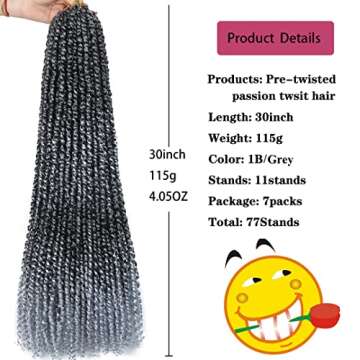 Show moreElevate your style with the stunning Omber Grey Passion Twist Hair, a luxurious choice for those seeking elegance and versatility in their hairstyles. These 30-inch long, pre-twisted crochet braids come in a beautiful ombre color scheme of dark grey (#1B) and light grey, expertly crafted to provide a natural and bohemian vibe. The soft, pre-looped design allows for quick installation, making it perfect for busy individuals who desire a stylish look without compromising on comfort or ease. Each pack contains 7 bundles, giving you a full, voluminous appearance that turns heads and leaves a lasting impression.