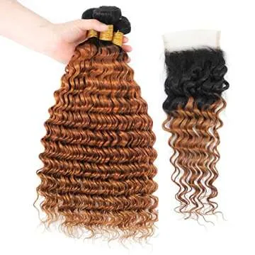 Ombre Deep Wave Human Hair 3 Bundles With 4x4 Lace Closure 1B/30 Brown Curly Bundles with Closure Unprocessed Brazilian Virgin Human Hair Extensions For Women (T1B/30,12 14 16 +10)