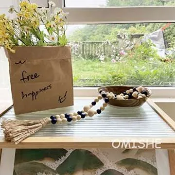 Show moreTransform your living spaces with the delightful OMISHE Wood Bead Garland with Tassels, an exquisite 61-inch decor piece that seamlessly blends rustic charm with contemporary style. Crafted from high-quality, natural wooden beads in two distinctive sizes, this bohemian garland features a sophisticated mix of beige and navy blue hues, ensuring it complements any decor theme. Perfectly designed to elevate your home’s aesthetic, this garland can be draped beautifully across shelves, as table centerpieces, or hung elegantly in various spaces. It's more than just decor; it's a touch of warmth and joy for your daily life, making it an ideal choice for housewarming gifts or delightful surprises for special occasions.