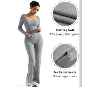 OMKAGI Women's Lounge Set: Stylish Lace Square Neck Tops & Wide Leg Pants 2 Piece Set (Grey)