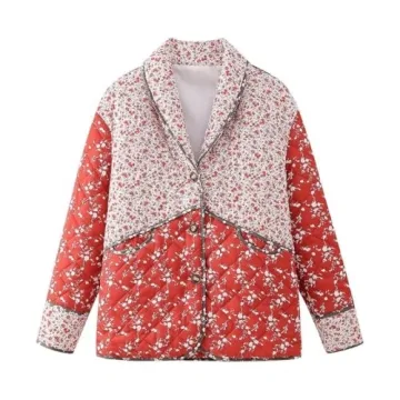 Omoone Women's Cropped Floral Quilted Jacket Cardigan Printed Lightweight Open Front Padded Winter Puffer Coat(Red-S)