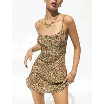Omoone Women's Floral Dress Low-Cut Square Neck Spaghetti Strap Tie Bodycorn Dresses(2226-Yellow-L)