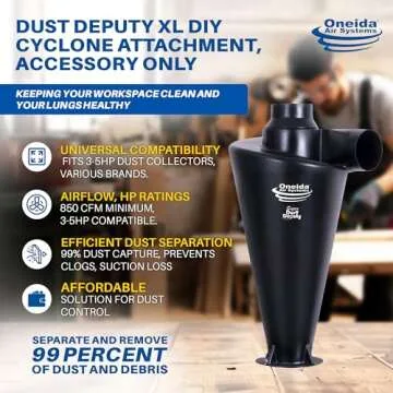Show moreTransform your woodworking experience with the Oneida Air Systems Super Dust Deputy XL 6" Retrofit Cyclone Separator. This innovative cyclone separator boasts a patented design that effectively stops up to 99.9% of fine dust and bulk debris from entering your dust collector, ensuring optimal performance and longevity. Compatible with any make or model of single-stage dust collectors with 3-5 HP, the Super Dust Deputy XL features 6" I.D. inlet and outlet ports to seamlessly integrate with your existing ductwork. Its robust construction and ease of installation make it a must-have accessory for any serious woodworker.