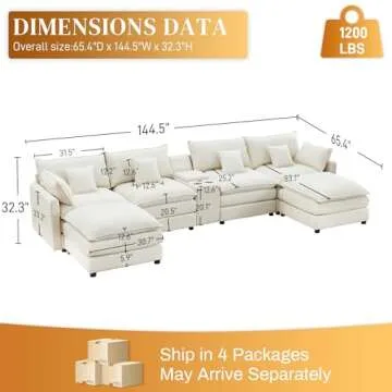 ONEMMLION 145" U Shaped Cloud Couch Sectional for Living Room, Oversized Modern Modular Sofa with Movable Ottoman, Comfy Fluffy Chenille 6 Seat Sofa Set with Central Console & USB Ports, White