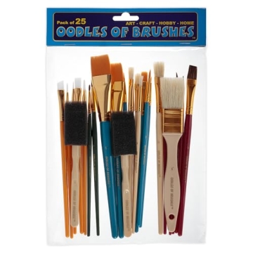 Show more Introducing the Oodles of Brushes Economical Art Brush Set of 25, the ultimate companion for artists, hobbyists, and DIY enthusiasts! This remarkable set features a well-balanced assortment of 25 high-quality brushes, designed specifically for art, craft, hobby, and home projects. The assorted styles include white nylon, natural hog bristle, golden Taklon, natural soft hair, and foam brushes, allowing for versatile use across a wide range of media. With this set in hand, you can seamlessly transition between watercolors, acrylics, oils, and even household touch-ups, all while enjoying exceptional value.