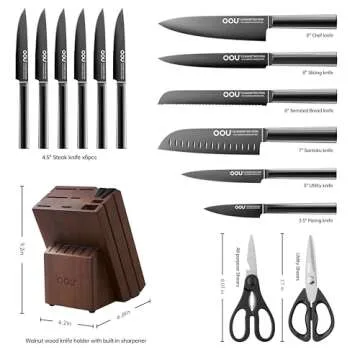 When compared to other knife sets on the market, the OOU Kitchen Knife Block Set shines due to its unique combination of high-quality materials and innovative technology. While many sets may sacrifice quality for design, OOU delivers both with its black oxide layer offering unbeatable protection against rust while maintaining a sleek aesthetic. Furthermore, its built-in sharpener within the wooden block ensures that your knives remain razor-sharp with minimal effort, a feature that outperforms many competing sets.