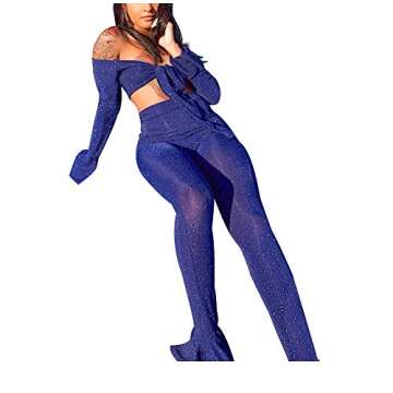 Show moreIntroducing the Ophestin Women's 2 Piece Outfits Jumpsuits, a dazzling ensemble that is bound to make you the center of attention at any event! This exquisite outfit features a captivating design combining an off-shoulder glitter see-through mesh long-sleeve crop top with elegant bell bottom pants. Crafted from a luxurious blend of 71%-80% polyester, it's not just about style, but also about comfort and ease of movement. The sequined top with charming ruffled sleeves offers a flirtatious touch that perfectly complements the fitted bell bottom pants, which are designed to elongate your legs and enhance your silhouette. Be prepared for the compliments!