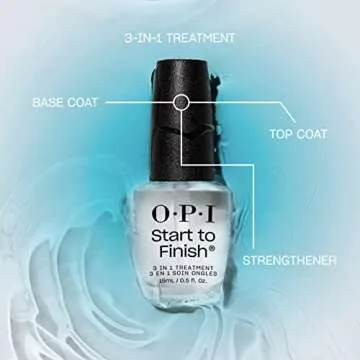 Show more Introducing the ultimate solution for nail care enthusiasts: the OPI Start to Finish 3-in-1 Nail Treatment. This innovative product combines the benefits of a base coat, top coat, and nail strengthener into one convenient formula, ensuring your nails stay healthy and beautifully polished.