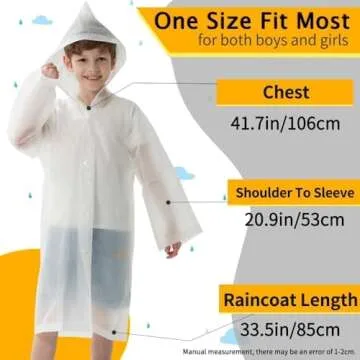 Show moreIntroducing the Opret 2 Pack White Raincoats for Kids – the perfect blend of functionality, safety, and style for children aged 6 to 13 years. Designed for every little adventurer, these raincoats feature a snug fit with dimensions that will keep your child comfortable and protected. The chest measurement of 41.7 inches, total cloth length of 33.5 inches, and shoulder to length of 20.9 inches make these ponchos ideal for kids between 3.7 to 4.7 feet tall. Lightweight yet durable, they draw attention with their bright color while ensuring that your child stays visible and safe in any weather condition.