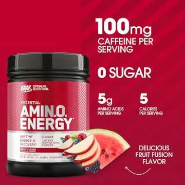 Show more Introducing the incredible Optimum Nutrition Amino Energy, a premium supplement designed to elevate your fitness routine! This unique blend features a perfect combination of amino acids that not only support muscle recovery but also deliver an energizing boost through natural sources like green tea and green coffee extracts. With a carefully measured 100 mg of caffeine, this product is your ideal partner for intense workouts or long workdays. Moreover, this energy blend is formulated to enhance your mental focus, helping you to power through any challenge the day throws at you.
