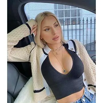 OQQ Women's 2 Piece Tank Top Ribbed Sleeveless Sexy Deep V Neck Removable Cups Yoga Crop, Black,beige, Medium