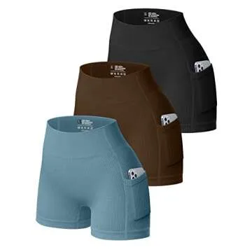 OQQ Women's 3 Piece Athletic Shorts Ribbed Seamless Workout High Waist Shorts with Pockets Black Coffee Blue