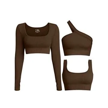 Show more Elevate your workout wardrobe with the OQQ Women's 3 Piece Crop Top Ribbed Long Sleeve Workout One Shoulder Yoga Exercise Sports Bra. Designed for the modern, active woman, this stylish coffee-colored ensemble blends functionality with flair. The ribbed texture not only enhances your silhouette but also delivers a secure fit while allowing for unrestricted movement. The unique one-shoulder design sets it apart from traditional sports bras, adding a chic element that transitions seamlessly from the gym to casual outings. Whether you're yoga stretching, jogging in the park, or hitting the weights, you’ll appreciate the thoughtful detailing and premium materials that make this outfit a go-to choice.
