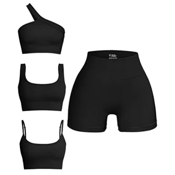Show moreIntroducing the OQQ Women's 4 Piece Outfits Ribbed Seamless Exercise Active Set, designed for the modern woman who seeks both style and functionality in her activewear. This stunning set includes a scoop neck sports bra, a trendy one-shoulder top, high-waisted shorts, and an additional piece to complete the look, all fashioned in an elegant black. Crafted from superior quality ribbed material, this outfit provides a snug yet comfortable fit, tailored to withstand your most intense workouts or casual outings when running errands.