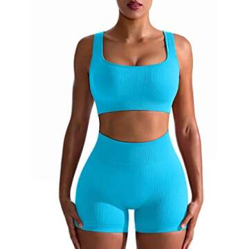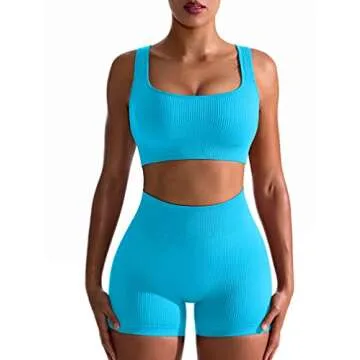 OQQ Women's Workout 2 Piece Seamless Ribbed High Waist Legging Sports Exercise Set Bra Outfit, Brightblue, Small