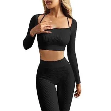 OQQ Women's Yoga 2 Piece Seamless Ribbed Workout High Waist Legging Crop Top Exercise Set Outfit, Black, Small