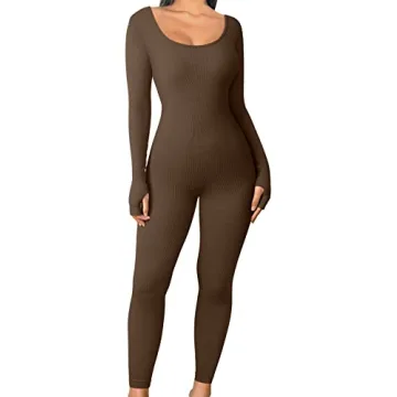 The stunning coffee color adds versatility to your closet, allowing you to pair it effortlessly with a variety of accessories and outerwear. The long sleeves offer extra coverage while the stretchy fabric ensures ease of movement, making it perfect for yoga sessions, jogging in the park, or even lounging at home. Designed by a reputable brand, this jumpsuit combines functionality with flair. The thoughtful design details cater to the modern woman's needs, from the thickness of the material that combats transparency to the stylish silhouette that flatters every body type.
