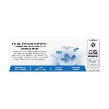 Show more Introducing the Orajel Complete Protection Deep Cleaning Sensitive Toothpaste, a remarkable oral care solution designed to cater to individuals with sensitive teeth. Each package contains two 6.0 oz tubes of this anticavity fluoride toothpaste, formulated to provide gentle whitening and enamel strengthening, all while delivering a refreshing Deep Clean Mint flavor.