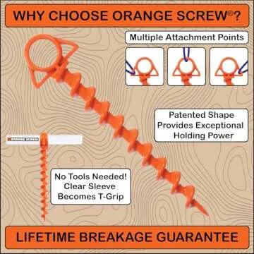Show more Introducing the Orange Screw Ultimate Ground Anchors, your personal guardian for securing gear against the fury of wind and the unpredictability of soft ground! Weighing in at just 3.6 oz and stretching to a robust 12 1/4 inches in length with a diameter of 1 1/8 inches, these heavy-duty anchors are crafted to hold a staggering 500 pounds. Whether it’s a sunny day at the beach or a windy evening camping trip, you can trust these innovative ground anchors to keep your tents, canopies, and shade shelters secure. Made from 100% recycled materials, they embody both sustainability and strength, and the vibrant orange hue makes them highly visible, ensuring you won't misplace them after use.