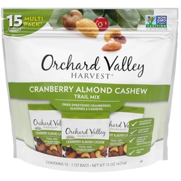 Show moreElevate your snacking experience with the Orchard Valley Harvest Cranberry Almond Cashew Trail Mix, a delightful combination of bold flavors and quality ingredients. This pack contains 15 individual 1-ounce bags, each one filled with a mouthwatering blend of sweetened dried cranberries, roasted and salted almonds, and creamy cashews. Expertly crafted to provide a satisfying balance of sweet and savory, these trail mix packs are perfect for those seeking both flavor and nutrition. Whether you're at home, in the office, or on the go, these convenient snack packs make it easy to enjoy a healthy treat anytime, anywhere. Plus, with a commitment to quality, all products from Orchard Valley Harvest are Non-GMO Project verified and free from artificial ingredients, colors, flavors, or preservatives, assuring you a wholesome snacking experience.