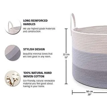 Show more Introducing the OrganiHaus Gray Extra Large Storage Basket, a perfect blend of style and functionality designed to enhance your home organization. Measuring 20 inches in diameter and 13 inches tall, this basket is not just a beautiful decorative piece but also a practical solution for storing blankets, clothes, toys, and more. Crafted from 100% natural cotton rope, this basket stands out with its attractive multi-tone gray color that easily complements any decor while adding a touch of elegance to your nursery or living space.