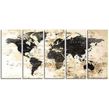 Show moreTransform your living space into a breathtaking travel-themed haven with the Original by BoxColors Xlarge 30"x 70" 5 Panels Wall Art Canvas Print. Measuring 30x14 inches per panel, this magnificent artwork showcases a beautiful watercolor rendition of a black and beige world map, designed for those with an adventurous spirit. Each canvas is framed with a 1.5" depth, adding a sophisticated touch to your home décor. Whether you are an avid traveler, a geography aficionado, or just love stunning art pieces, this canvas print is the perfect addition to your walls, igniting your wanderlust every time you glance at it.
