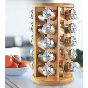 Orii 20 Jar Bamboo Spice Rack with Spices Included - Rotating Tower Organizer for Kitchen Spices and Seasonings, (Bamboo Wood)