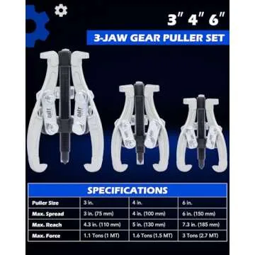 The set is exceptionally equipped with three different sized pullers, each with maximum spreads of 3", 4", and 6" and impressive reach capabilities of 4.3", 5", and 7.3", ensuring you have the right tool for almost any application*