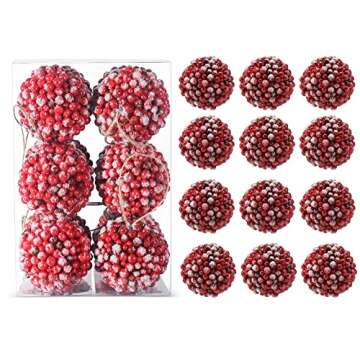 Show moreTransform your Christmas celebrations with the exquisite Ornativity Frosted Red Berries Ornaments. Designed to bring a touch of elegance and festive spirit, these stunning decorations feature beautifully crafted red cranberry berries adorned with glittered white snowflakes. Each ornament measures a perfect 2.4" x 2.4", making them versatile enough to fit seamlessly on both large and average-sized Christmas trees. The rustic twine string allows for a secure and aesthetic attachment, enhancing the overall look of your holiday decor. With a set of 12, you can easily create a cohesive and charming theme throughout your home.