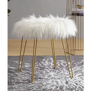 Show more Introducing the Ornavo Home Modern Contemporary Faux Fur Vanity Chair Round Ottoman— a stunning fusion of luxury and functionality that enhances any interior space. With its plush faux fur upholstery, this ottoman combines an inviting tactile feel with the durability needed for everyday use. Standing at a convenient height of 18 inches, with a 17-inch diameter, it serves as a versatile footrest, an additional seat, or even a stylish side table. The sophisticated gold metal legs not only add stability but also provide a chic pop of color that perfectly complements your decor.
