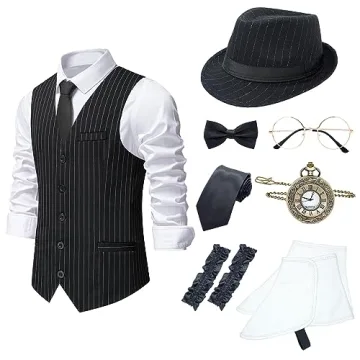 Show moreStep back in time with the OSEMIOKA 1920s Mens Gatsby Gangster Vest, a meticulously crafted costume ensemble that exudes the charm and class of the Roaring Twenties. This breathtaking set includes everything you need to make a bold statement at your next themed event. Featuring a stunning Gatsby Gangster Vest tailored for a perfect fit, along with a stylish Mens Panama Hat, this ensemble promises not only to elevate your look but also to envelop you in the spirit of one of the most lively eras in fashion. The inclusion of a pre-tied bow tie, a traditional tie, an elegant vintage pocket watch, and a pair of sophisticated garters ensure you have all the quintessential 1920s details covered. Furthermore, the costume is topped off with retro round glasses that truly complete your transformation into a dapper gentleman of the jazz age.