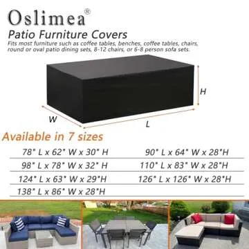 Show more Transform the way you protect your outdoor furniture with this exceptional patio furniture cover! Designed with a perfect blend of durability and practicality, this cover measures 124 x 63 x 29 inches, making it compatible with a variety of furniture types including coffee tables, benches, and even large outdoor dining sets. Crafted from 420D material with reinforced stitching, it boasts a waterproof and tear-resistant texture that ensures lasting protection against the elements.