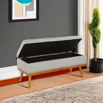 Show moreIntroducing the OSP Home Furnishings Katheryn Storage Bench – a stunning blend of mid-century modern style and functional design. Finished in a beautiful light grey fabric, this storage bench not only enhances the aesthetic of your home but also provides smart storage solutions for your living space. With a total size of 43.5 inches W x 17 inches D x 18.5 inches H, it is perfectly designed to fit snugly in any area of your home, making it an ideal choice for entryways, living rooms, or even bedrooms.